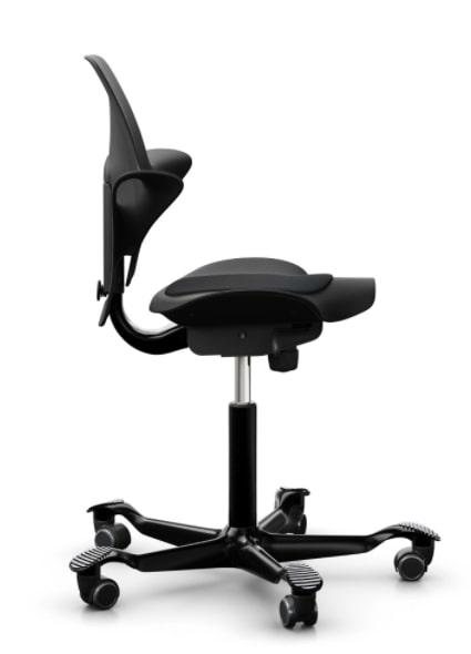 De HÅG Capisco Puls 8010 is voorzien van een zadelzitting. Een zadelzitting zorgt ervoor dat je makkelijk rechtop kunt zitten. Je zit met je knieën lager dan je heupen. Dat zorgt ervoor dat het bekken een neutralere positie behoudt. Hierdoor behoudt ook de wervelkolom een neutralere positie. Dat zorgt er op zijn beurt weer voor dat de wervels beter boven elkaar staan uitgelijnd, waardoor je minder snel ‘krom’ gaat zitten. Zo werk je dynamisch en actief.